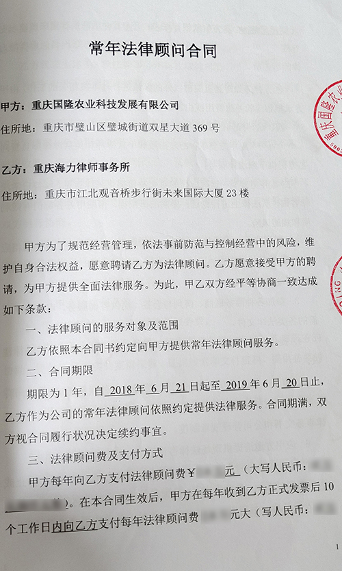 重庆国隆农业科技发展有限公司聘请我所为常年法律顾问