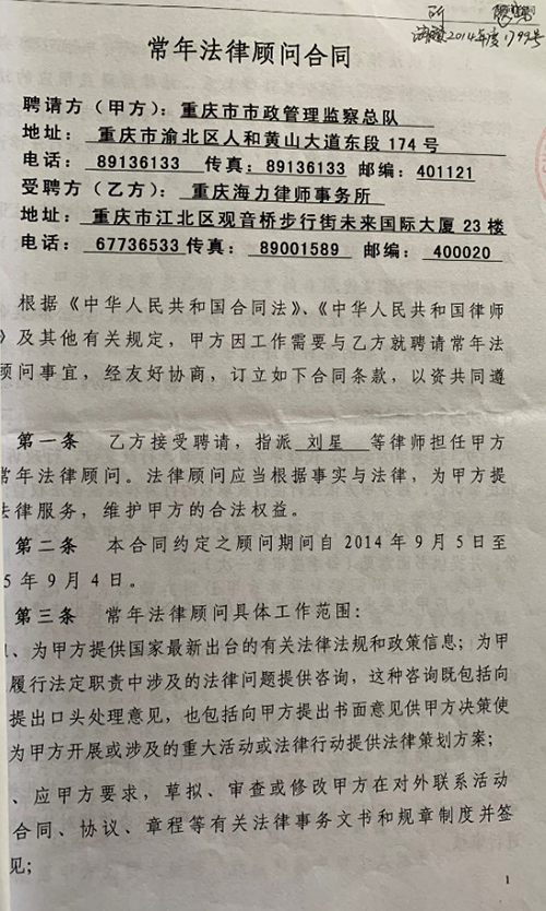 重庆市市政管理监察总队聘请我所为常年法律顾问