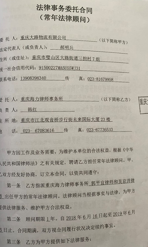 重庆大路物流有限公司聘请我所为常年法律顾问